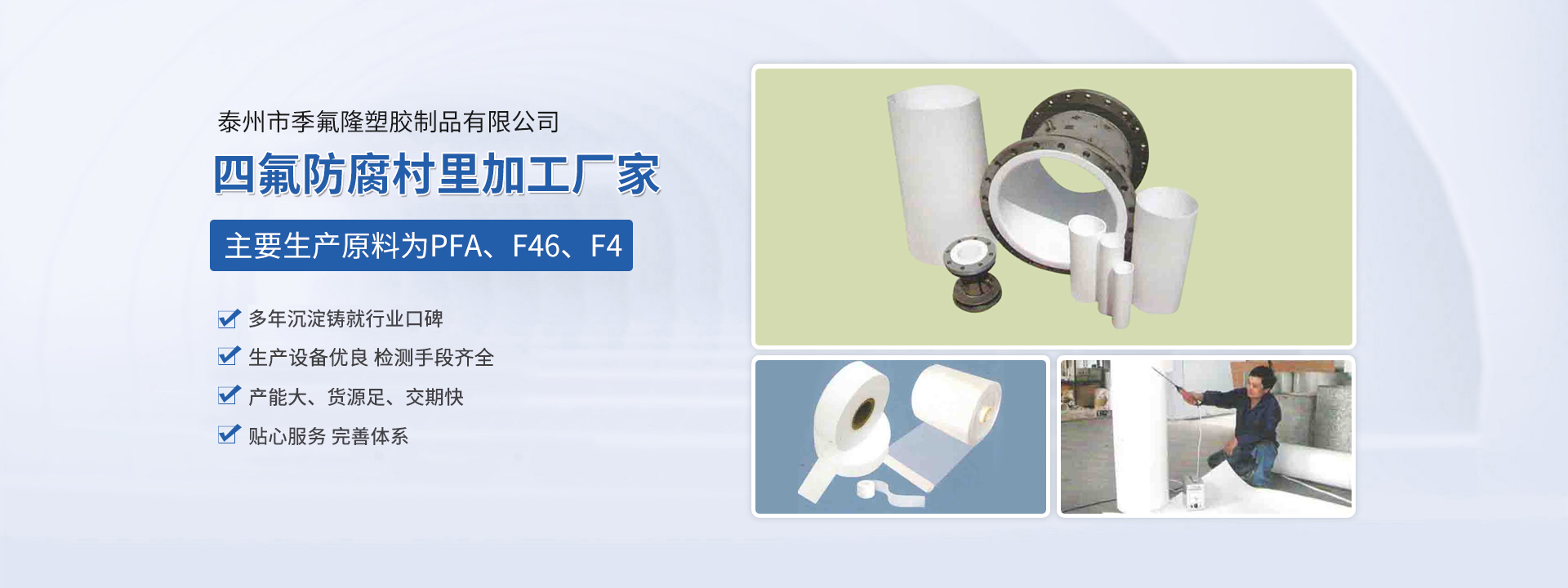 泰州市季氟隆塑膠制品有限公司(江蘇斯瑞沃爾科技發(fā)展有限公司)占地8000平方米,各類專用生產(chǎn)設(shè)備三十多合,現(xiàn)有員工近20人,其中技術(shù)人員10名,均多年從事該行業(yè)生產(chǎn),經(jīng)驗豐富。本公司主要生產(chǎn)原料為PFA、F46、F4,主要為電磁傳感器、防腐管道、各種容器反應(yīng)釜三通四通彎頭及各種閥門等產(chǎn)品進(jìn)行防腐村里加工,長期為德國、日本、美國、新加坡等國在華合資公司配套,產(chǎn)品廣泛應(yīng)用于環(huán)保、油田、化工、造紙、冶金等行業(yè),產(chǎn)品質(zhì)量優(yōu)良,服務(wù)及時周到,一直深受顧客信賴。